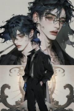 super realistic,best quality,insane details, intricate details, hyperdetailed, hyper quality, high detail, ultra detailed, Masterpiece,depth of field, Ultra High Quality, (masterpiece:1.2), best quality,realistic,midjourney,1boy, gloves, male focus, quill, glasses, jewelry, earrings, eyewear strap, white background, deep blue hair, monocle, holding, black gloves, short hair, hand in pocket, book, shirt, long sleeves, simple background, looking at viewer, tassel, hair between eyes, multiple views, lamp, bangs, collared shirt, paper, single earring, coat, pants, black coat, round eyewear, closed mouth, solo , a boy with deep blue hair_long hair_hanfu, Detail,green eyes, jingxuan
