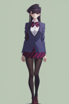 <lora:Shouko-000010:1>,Shouko CYQL,1girl,solo,looking at viewer,long hair,black hair,black eyes,school uniform,long sleeves,jacket,blue jacket,shirt,collared shirt,white shirt,bowtie,striped bowtie,skirt,red skirt,pleated skirt,striped skirt,pantyhose,black pantyhose,shoes,uwabaki,lawngreen background,simple background,posing,masterpiece,best quality,beautiful and aesthetic,