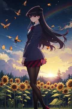 <lora:Shouko-000010:1>,Shouko CYQL,1girl,solo,looking at viewer,long hair,black hair,black eyes,school uniform,long sleeves,jacket,blue jacket,shirt,collared shirt,white shirt,bowtie,striped bowtie,skirt,red skirt,pleated skirt,striped skirt,pantyhose,black pantyhose,shoes,uwabaki,smile,profile,Sunflowers, Field, Dawn, Golden petals, Bees, Sunlight, Horizon, Harvest,(Moss-covered stones, Moss garden, Spring rain, Zen serenity, Refreshing drizzle, Japanese tranquility:0.5),beautiful detailed sky,beautiful detailed glow,posing in front of a colorful and dynamic background,masterpiece,best quality,beautiful and aesthetic,contrapposto,female focus,wallpaper,