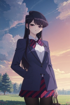 <lora:Shouko-000010:1>,Shouko CYQL,1girl,solo,looking at viewer,long hair,black hair,black eyes,school uniform,long sleeves,jacket,blue jacket,shirt,collared shirt,white shirt,bowtie,striped bowtie,skirt,red skirt,pleated skirt,striped skirt,pantyhose,black pantyhose,shoes,uwabaki,smile,portrait,Lakeside meadow, Picnic, Noontime sun, Nature scenery, Enjoyment, Relaxation,(Bluebells, Beech trees, Misty dawn, Carpet of flowers, Early morning light, Birdsong:0.5),beautiful detailed sky,beautiful detailed glow,posing in front of a colorful and dynamic background,masterpiece,best quality,beautiful and aesthetic,contrapposto,female focus,wallpaper,