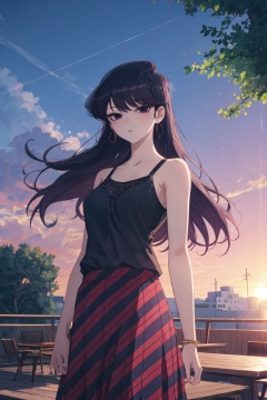 <lora:Shouko-000010:0.8>,Shouko CYQL,1girl,solo,looking at viewer,long hair,black hair,black eyes,(Silk_cami_top:1.5),(Flowy_maxi_skirt:1.4),(Statement_earrings:1.3),(Roof_deck_background:1.5),happy,cowboy_shot,Sunset, Vineyard, Grapes, Sky, Colors, Horizon, Serenity, Harvest,(Roses, Tulips, Daffodils, Morning dew, Soft sunlight, Birdsong:0.5),beautiful detailed sky,beautiful detailed glow,posing in front of a colorful and dynamic background,masterpiece,best quality,beautiful and aesthetic,contrapposto,female focus,wallpaper,