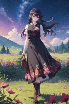 <lora:Shouko-000010:0.8>,Shouko CYQL,1girl,solo,looking at viewer,long hair,black hair,black eyes,(Bohemian_maxi_dress:1.4),(Embroidered_suede_vest:1.3),(Fringe_ankle_boots:1.2),(Open_field_with_wildflowers_background:1.4),female_orgasm,panorama,Foggy mountain, Hiking trail, Morning light, Adventure, Solitude, Nature sounds,(Lavender rows, Purple blooms, Summer sunshine, Fragrant air, Lavender harvest, English countryside:0.5),beautiful detailed sky,beautiful detailed glow,posing in front of a colorful and dynamic background,masterpiece,best quality,beautiful and aesthetic,contrapposto,female focus,wallpaper,