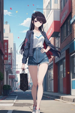 <lora:Shouko-000010:0.8>,Shouko CYQL,1girl,solo,looking at viewer,long hair,black hair,black eyes,(Denim_jacket:1.4),(High-waisted_shorts:1.3),(Sneakers:1.2),(City_street_background:1.4),shy,cowboy_shot,Street cultural festival, Celebrations, Music, Food, Art,(Cherry blossoms, Pagoda, Koi pond, Cherry blossom festival, Japanese tranquility, Cherry blossom petals:0.5),beautiful detailed sky,beautiful detailed glow,posing in front of a colorful and dynamic background,masterpiece,best quality,beautiful and aesthetic,contrapposto,female focus,wallpaper,