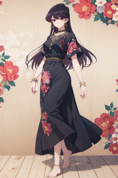 <lora:Shouko-000010:0.8>,Shouko CYQL,1girl,solo,looking at viewer,long hair,black hair,black eyes,(Boho_floral_maxi_dress:1.5),(Barefoot_sandals:1.4),(Wooden_beaded_bracelets:1.3),(Boho_festival_background:1.4),smile,portrait,Palace of Versailles, Afternoon tour, Gardens, History, Opulence,(Lavender rows, Sunset glow, Fragrant air, Golden hues, Lavender harvest, Provencal charm:0.5),beautiful detailed sky,beautiful detailed glow,posing in front of a colorful and dynamic background,masterpiece,best quality,beautiful and aesthetic,contrapposto,female focus,wallpaper,