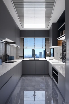 sky, day, indoors, blue sky, no humans, window, building, scenery, tiles, cityscape, tile floor, bathroom, shelf, kitchen, sink, ceiling light, faucet, cabinet, blinds