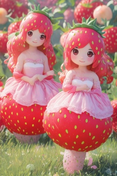 In a lively Anime-style scene, a bunch of anthropomorphic strawberry princesses are standing gracefully, wearing charming dresses, their looks brimming with sweetness. They are having a tea party. The camera records the scene from a side angle, with a background of a colorful, fragrant fruit garden, filled with charm and joy, all in 8K cinematic quality.