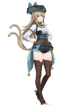 score_9, score_8_up, score_7_up, score_anime, 8k, best quality, masterpiece, (ultra-detailed), (white background,simple background:1.3), solo, hands on hip, (full body:1.1), looking at viewer, <lora:yll-pony-Tanger:0.8>, yll, alternate costume, youxia, nekomata girl, 1girl, brown gloves, green eyes, long hair, hat, thighhighs, thigh boots, shorts, (2 tails, cat tails:1.2), cat feet,