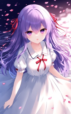 (masterpiece),(best quality),illustration,ultra detailed,hdr,Depth of field,(colorful),loli,[Artist wlop],[[Artist sheya]],[Artist chen bin],Artist hiten_(hitenkei),1girl,solo,dress,long hair,official alternate costume,ribbon,purple hair,matou sakura,purple eyes,hair ribbon,white dress,open mouth,short sleeves,looking at viewer,red ribbon,puffy short sleeves,hair between eyes,puffy sleeves,breasts,petals,collared dress,collarbone,