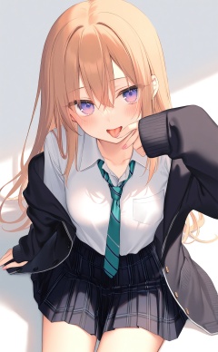 (masterpiece),(best quality),illustration,ultra detailed,hdr,Depth of field,(colorful),loli,[Artist wlop],[Artist chen bin],Artist hiten_(hitenkei),Artist\:agwing86,Artist\:aki99,(artist_mignon:1.3),(artist_atdan:1.2),(artist_rurudo:1.2),(artist_tokkyu:1.1),(artist_ru_zhai:1.1),(artist_toosaka_asagi:1.05),[artist_miwano_rag],[artist_chen_bin],[artist_wlop],1girl, skirt, shirt, solo, necktie, green necktie, white shirt, tongue, looking at viewer, long hair, diagonal-striped clothes, collared shirt, brown hair, tongue out, diagonal-striped necktie, long sleeves, black skirt, open clothes, school uniform, blush, plaid, black jacket, pleated skirt, sitting, plaid skirt, jacket, shadow, breasts, shirt tucked in, purple eyes, sleeves past wrists, hand up, pink nails, striped necktie, white background, striped clothes, black cardigan, feet out of frame, loose necktie, smile, open mouth, pocket, open jacket, hood, off shoulder, sidelocks, simple background, medium breasts, cardigan, dress shirt, blue eyes, hair between eyes, licking finger, hood down