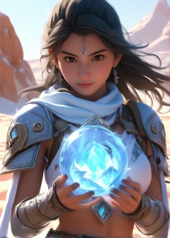 a beautiful girl standing. She uses the magic ring and turns into a beautiful ice magic \(ek_ges1ba\) warrior \(detailed exquisite face\),ek_game_3ffect,dynamic sexy pose,ice elemental effects,ice weapon, desert,sand,wind,oasis,sky,cloud, By studio ghibli,
