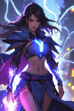 a beautiful lightning magic sorceress \(ek_ge1tng\),detailed exquisite face,lightning elemental effect,lightning weapon,ek_game_3ffect,dynamic pose,simple background,blurry city background,dynamic angle,anime style by ghibli,detailed,ek_ph0t0_b00ster,ek_an1_b00ster
