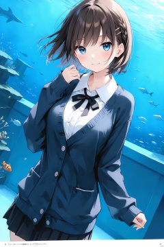 1girl, aquarium, skirt, solo, hair_ornament, looking_at_viewer, bangs, breasts, blush, smile, closed_mouth, shirt, long_sleeves, medium_breasts, blue_cardigan, dutch_angle, buttons, black_hair, blue_eyes, page_number, brown_hair, fish, water, cardigan, short_hair, shiny_hair, ribbon, shiny, open_clothes, braid, multicolored_hair, sleeves_past_wrists, hairclip, jacket, frills, hair_ribbon, white_shirt,