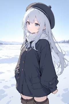 (masterpiece),(best quality),(sketch),solo,1girl,long hair,beret,knee boots,cotton boots,winter,upper body,looking_sky