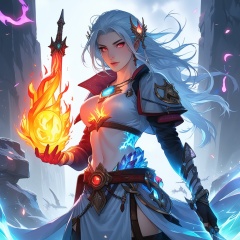 a beautiful ice magic sorceress \(ek_ges1ba\),detailed exquisite face,[using fire elemental effect \(ek_ge1frt\) together],fire and ice weapon,ek_game_3ffect,dynamic pose,simple background,blurry ruins background,dynamic angle,anime style by makoto shinkai,detailed,ek_ph0t0_b00ster