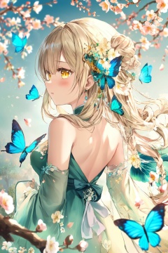 ,butterfly,blue_butterfly,1girl,gloves,white_butterfly,branch,flower,long_hair,ass,dress,bird,green_eyes,cherry_blossoms,hair_ornament,solo,ahoge,black_gloves,bare_shoulders,butterfly_on_hand,backless_outfit,looking_at_viewer,bangs,chinese_clothes,backless_dress,animal,hair_flower,glowing_butterfly,breasts,butterfly_hair_ornament,yellow_butterfly,hair_between_eyes,floral_background,k7,torino,Q,transparent,cartoon,noyu,melting,mercury