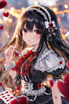 masterpiece, best quality, realistic,loli,1girl, card, playing card, solo, blurry, long hair, looking at viewer, black hair, blurry foreground, depth of field, heart, ace (playing card), brown hair, gothic lolita, hairband, black eyes, lolita fashion, red lips, lolita hairband, foreshortening,k7,torino,Q,transparent,cartoon,noyu,melting,mercury