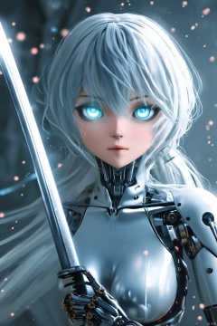 cool,1mechanical girl,(holding sword:1.1),shadows,ultra sharp,metal,(cold colors),rending on cgsociety,facing camera,machanical limbs,mechanical cervial attaching to neck,ghost in the shell,anime art style,looking_at_viewer,masterpiece,best quality,(ultra realistic details),glass-**** sparkling eyes are blurry and dreamy,muscle tone and definition,high contrast eyes,finely detailed features,stunning colors,cinematic lighting effects,super wide Angle,light particles,light particle art,(glowing:1.1),Wear clothes,don't show,