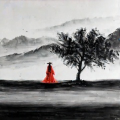 ,tree,mountains,ink painting,a drawing of luffy crouched with his hand holding onto the straw hat,the straw hat covers the face,cry,front view,red coat,yellow straw hat,