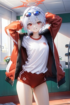 long hair, breasts, bangs, medium breasts, shirt, red eyes, hair between eyes, jacket, white shirt, braid, white hair, sweat, open jacket, single braid, halo, eyewear on head, red jacket, gym uniform, track jacket, buruma, jacket on shoulders, gym shirt, red buruma, harunaGym, ((white shirt)), ,sunlight,harunaBA, bare thighs,cowboy_shot, smile, hands behind body, nai3