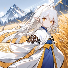 bm tol,ask \(askzy\),(mountain han:2),kidmo,applepie \(12711019\),minimalism,close-up,looking at viewer,1girl,solo,eyeshadow,crossed bangs,ahoge,very long hair,yellow eyes,curly hair,(white hair:1.5),pensive,sad smile,pointy ears,White dense eyelashes,Exquisite clothing,white Chinese clothes,(white hanfu:1.1),yellow belt,sleeves past fingers,yellow Marginal decoration,white long boots,wheat field,mountain,