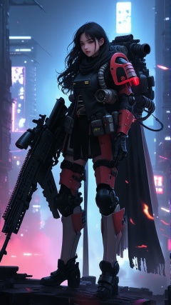 a girl in armor suit \(ek_g4k\),holding rifle,warhammer 4K style,ek_game_3ffect,dynamic pose,simple background,blurry futuristic city background,smoke,dynamic angle,anime style by ghibli,detailed,ek_ph0t0_b00ster,ek_an1_b00ster,at night,dark