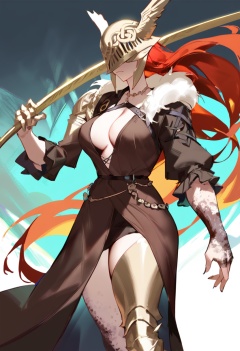 1girl,shiro9jira, ciloranko, ask \(askzy\), (tianliang duohe fangdongye:0.8),leg armor, chainmail, brown dress, scar, white fur trim, golden winged helmet, single mechanical arm, fiery red hair, malenia blade of miquella,breasts, weapon, holding weapon, sword, holding, holding sword, large breasts, closed mouth, cleavage, cowboy shot,masterpiece, best quality, newest, absurdres, safe <lora:nws_v1.2-000015:1>