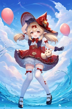 score_9,score_8_up,score_7_up,score_6_up,source_anime,source_cartoon,<lora:kleeTponyXL-000001:1>,klee \(Blossoming Starlight\),klee \(genshin impact\),1girl,witch hat,solo,blonde hair,black gloves,red eyes,puffy short sleeves,bow,balloon,smile,open mouth,red bow,low twintails,red bowtie,sky,white thighhighs,red headwear,red dress,pointy ears,official alternate costume,cloud,mary janes,white bloomers,looking at viewer,blue sky,full body,puffy sleeves,arm up,:d,outdoors,ribbon,day,loli,