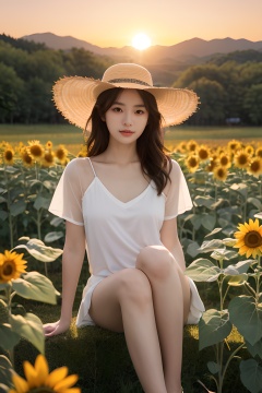 <lora:0809_01:0.7>,a girl with a sun hat, sitting in a field of sunflowers, bathed in the golden glow of sunset, warm hues, peaceful ambiance, natural beauty.korean girl,black hair,, 1girl,realistic,masterpiece, best quality, photorealistic, HDR,detail