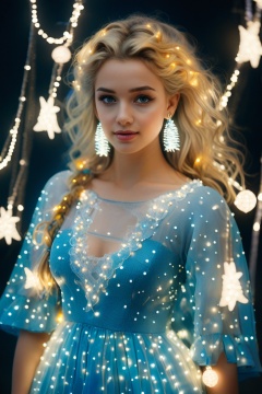 A woman with blonde hair is wearing a blue dress. There are lights on the dress. The lights are white and yellow. The woman has earrings in her ears.