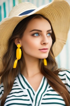 A woman is wearing a large straw hat. She has long brown hair and is wearing large yellow earrings. There is a striped shirt under the hat. The woman has blue eyes and is looking off to the side.