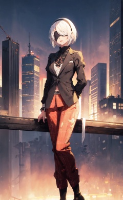 <lora:2B-000017:0.8>,2B CYQL,1girl,looking at viewer,solo,white hair,short hair,hairband,black hairband,covered eyes,black blindfold,mole,mole under mouth,full body,(Plaid_blazer:1.4),(Turtleneck_sweater:1.3),(Cropped_trousers:1.2),(Modern_art_gallery_background:1.4),:d,upper_body,Skyscrapers, Height, Architecture, Skyline, Urban,(Lavender rows, Provencal farmhouse, Rolling hills, Lavender harvest, French countryside, Purple carpet:0.5),beautiful detailed sky,beautiful detailed glow,posing in front of a colorful and dynamic background,masterpiece,best quality,beautiful and aesthetic,contrapposto,female focus,wallpaper,