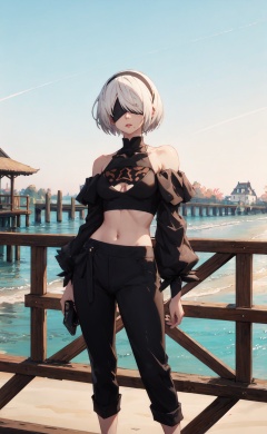<lora:2B-000017:0.8>,2B CYQL,1girl,looking at viewer,solo,white hair,short hair,hairband,black hairband,covered eyes,black blindfold,mole,mole under mouth,full body,(Off-the-shoulder_blouse:1.4),(Wide-leg_cropped_pants:1.3),(Woven_handbag:1.2),(Beachside_cafe_background:1.4),smile,cowboy_shot,Bridges, River, Architecture, Landmarks, Waterfront,(Cherry blossoms, Garden path, Dawn light, Sakura petals, Tranquil setting, Japanese elegance:0.5),beautiful detailed sky,beautiful detailed glow,posing in front of a colorful and dynamic background,masterpiece,best quality,beautiful and aesthetic,contrapposto,female focus,wallpaper,