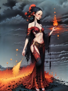 highly detailed,best quality,high resolution,volcano,(lava flow\(glowing, splash, high in the air, surrounding a girl\):1.2),full shot,front view,(background\( shanhaijing, cloud, volcano, light color, lava splash\) :1.2),full body,high resolution,masterpiece,A girl dancing the peacock dance,dressed in ethnic costumes,Yang Liping,with flowers,Peacock feathers,flat style,