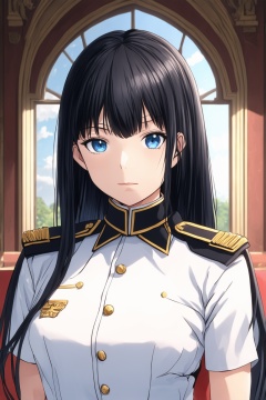 anime, ((Black hair)), center parthair, straight long hair, blue eyes, doyagao, wearing a ((military uniform:1.3)), by Raphael, masterpiece, upper body shot, magnificent indoor hall, Herioce,1 girl