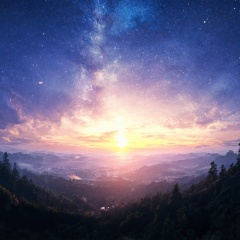 Dawn, intricate, recognizing the land, into the forest, only light of the stars, wonderful sky, view from the low, deep background, cinematic light. dynamic light,