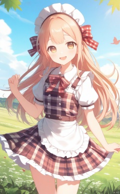 The image is a piece of artwork featuring an anime-style character. The character has distinctive features such as large eyes, long hair, and a detailed outfit that includes a bow and a checkered apron. The background suggests a natural outdoor setting with a sky and grass, which adds to the serene and playful atmosphere of the illustration. The character's pose and expression convey a sense of joy and playfulness.