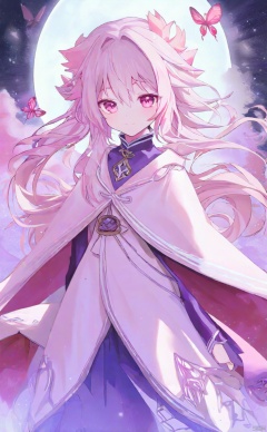 The image depicts a character with anime-style features, which includes large eyes and detailed hair. The character's attire suggests a fantasy or magical theme, indicated by the clover-like shapes and the cloak-like garment. The use of color is notable, with a focus on pinks and purples, which are often associated with magic or fantasy in visual storytelling. The background has an ethereal quality, with colors that blend into each other, suggesting a dreamlike or otherworldly setting. There is no explicit context provided within the image itself, so any additional narrative or background would be speculative without further information.