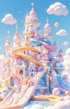 youleyuan2,balloon:0.6,cloud,day,outdoors,stairs,sky,bird,water,<lora:chengbao-000020:1>,