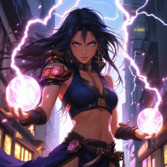 a beautiful lightning magic sorceress \(ek_ge1tng\),detailed exquisite face,lightning elemental effect,lightning weapon,ek_game_3ffect,dynamic pose,blurry city street background,dynamic angle,anime style by ghibli,detailed,ek_ph0t0_b00ster,ek_an1_b00ster,sexy pose,lightning balls in both hands,close up