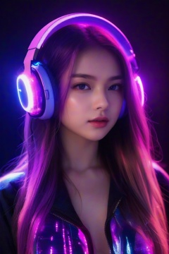 masterpiece, best quality, photorealistic, 1girl, solo, long flowing hair, neon purple hair, looking at viewer, upper body, Black Background, minimal background, neon lighting, smooth shadows, confident expression, detailed skin, soft features, modern setup, classic portrait style, high clarity, simple background, cinematic lighting, wearing large glowing headphones and a high-tech DJ outfit with LED patterns, futuristic and vibrant