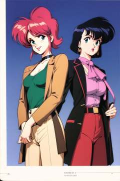 multiple girls, 2girls, retro artstyle, black hair, pink hair, blue eyes, short hair, earrings, 1990s (style), choker, jewelry, gun, long sleeves, open mouth, ascot, weapon, skirt, lipstick, smile, green eyes, gradient background, gradient, jacket, handgun, suspenders, coat, copyright name, hand on own chest, android, robot, shirt,<lora:Kenichi Sonoda:0.8>