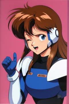 1girl, solo, one eye closed, gloves, blue eyes, retro artstyle, long hair, spikes, brown hair, white background, armor, open mouth, simple background, shoulder armor, looking at viewer, brown gloves, headgear, helmet, upper body, 1990s (style),<lora:Kenichi Sonoda:0.8>