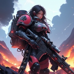 a girl in warhammer 4K style armor suit \(ek_g4k\),holding rifle,ek_game_3ffect,looking at viewer,blurry alien landscape background,smoke,flame,dynamic angle,anime style by makoto shinkai,detailed, ek_ph0t0_b00ster, ek_an1_b00ster,upperbody shot