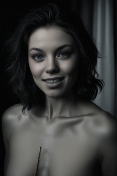 Portrait Photo of a cheeky smiling naked italian woman, taned skin.  Intense gaze. large saggy breast. Simple bracelets. Dark, mysterious room. Faustian.