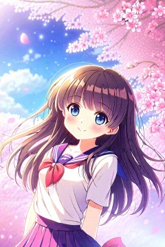 A cute anime girl next to a cherry blossom tree
