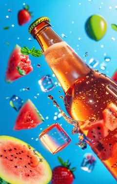 pijiuzz,no humans,beer bottle,depth of field,watermelon,ice,water droplets,ice cubes,and watermelon slices collide around the product against a blue background,and juice surrounds the fruity beer bottle,with a high sense of realism and meticulous style,and bright colors,<lora:pijiupz:1>,