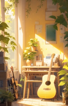 fangjian2,guitar,no humans,instrument,plant,window,scenery,lamp,chair,book,sunlight,shelf,acoustic guitar,indoors,flower pot,desk,<lora:fangjian2:1>,