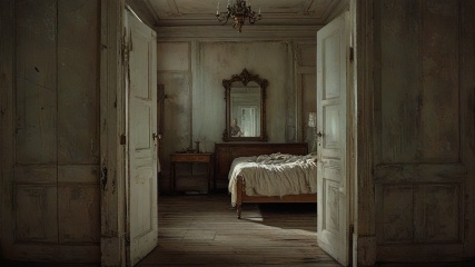 门缓缓打开,镜头迅速拉远,呈现出整个房间的全景,昏暗的灯光和深沉的阴影掩盖了房间的大部分细节,但在房间中央有一张旧床,床上躺着一个模糊的身影,被单微微起伏,此时,第一人称视角的镜头转向床边的镜子,镜子里映出一个扭曲的人脸,正盯着镜头,眼睛空洞无神,