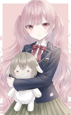 1girl, solo, long hair, looking at viewer, bangs, skirt, shirt, red eyes, long sleeves, bow, holding, very long hair, closed mouth, school uniform, jacket, white shirt, pink hair, flower, heart, pleated skirt, striped, collared shirt, virtual youtuber, bowtie, pink eyes, red bow, petals, rose, border, pink background, blazer, blue jacket, green skirt, pink flower, striped bow, object hug, doll, character doll, pink rose, striped bowtie, striped skirt, holding doll, mori calliope