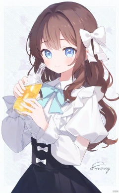 The image is a piece of artwork that features a character with anime-style illustrations. The character has large blue eyes, brown hair tied in a bow with a ribbon, and is wearing a white blouse with ruffled sleeves and a dark skirt. She is holding a glass bottle, which suggests she might be enjoying a drink. The background is minimalistic, with a light pattern that doesn't distract from the main subject. The overall impression is one of a stylized, youthful character, possibly from a manga or anime series, depicted in a way that emphasizes her innocence and charm.